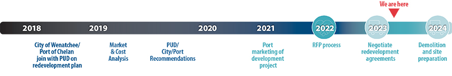 The remaining 117,360 SF of the former PUD headquarters building and adjacent lots along Wenatchee Avenue will be marketed to potential development partners. This may include demolition of the remaining buildings. The community, a local advisory group and representatives of the Chelan-Douglas Regional Port Authority, City of Wenatchee, Wenatchee Valley Chamber of Commerce and the Downtown Wenatchee Association worked with the PUD in 2019 to develop a vision for redevelopment of the 7.5 acre campus.